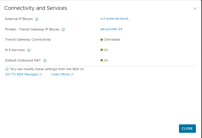 1. After clicking VIEW DETAILS under Connectivity and Services, it can be seen that the VPC automatically inherits the configuration from the project’s connectivity profile, including the external IP pool (vcf-external-block) and the transit gateway pool (lab-private-24).