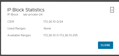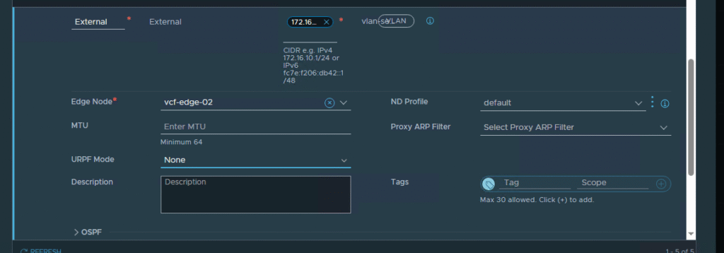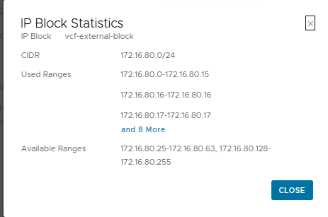 • Subnet size: 64 (meaning NSX will carve out a /26 subnet from the vcf-external-block pool)