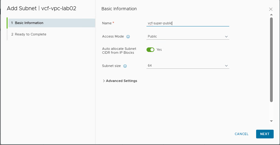 1. After creating the VPC, a subnet must be added to serve as the management network for the Supervisor. The key element here is to create a public subnet. This is a requirement because the Supervisor’s control plane VMs must be able to communicate with external components (e.g., vCenter, image repositories). A private network would not be sufficient in this case.