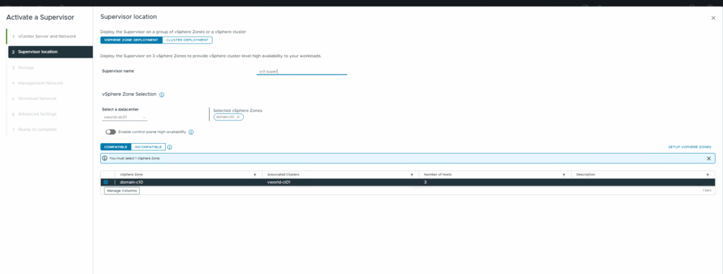 • vSphere Zone Selection: The data center and the vSphere Zone that will host the Supervisor’s management plane must be selected. In my case, this is domain-cl0. VCF allows for multi-zone deployments for high availability, but for a lab, I am starting with a single zone.