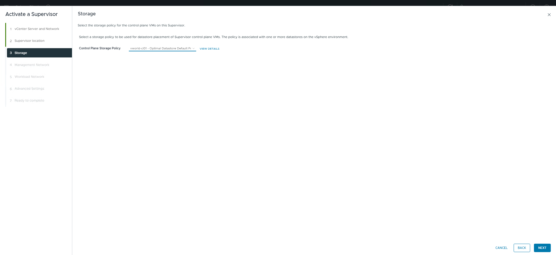 The chosen storage policy for the Supervisor control plane VMs is the default policy for vSAN: vworld-cl01 - Optimal Datastore Default Policy - RAID1.