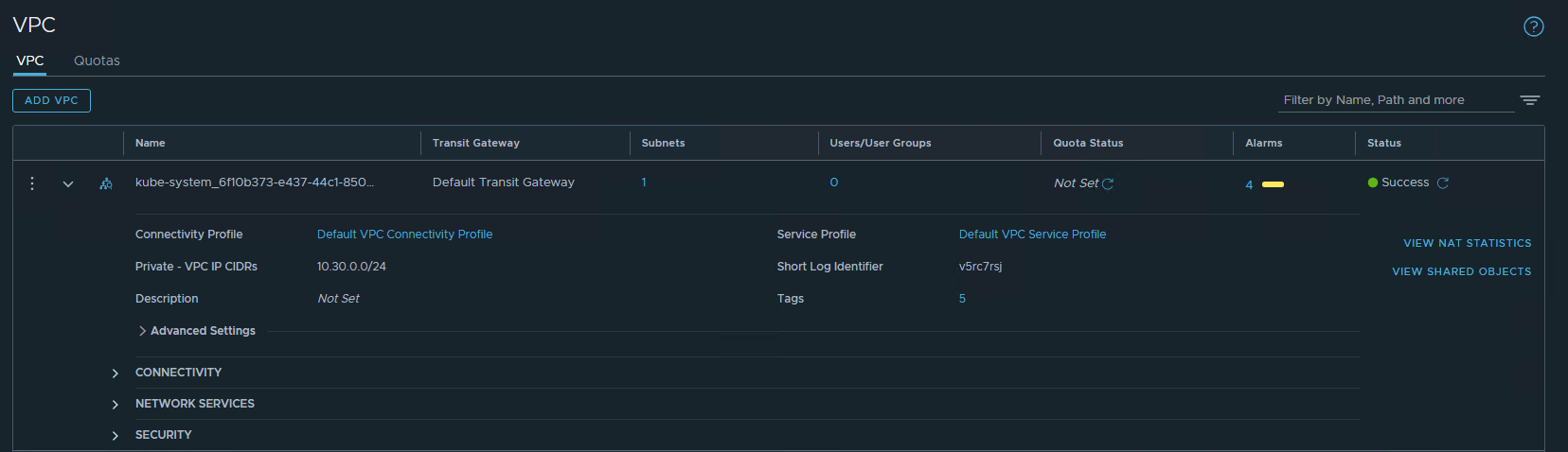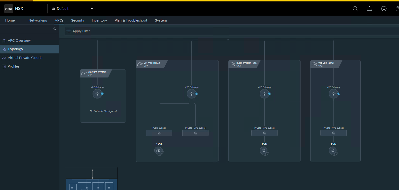 Each of these VPCs has its own gateway (VPC Gateway), ensuring complete isolation of system traffic from user workloads. This is perfectly visible in the NSX topology view.