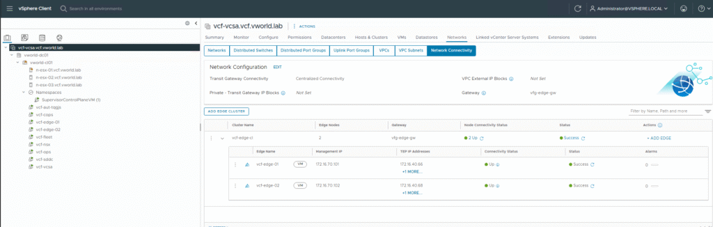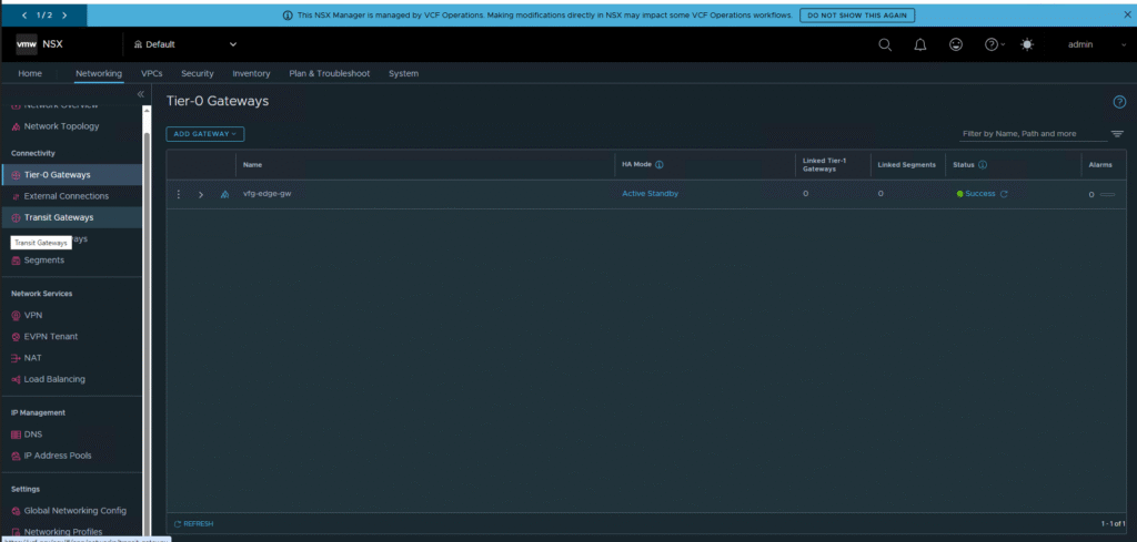 1. NSX Manager ▶ Tier-0 Gateways — vcf-edge-gw shows status Success